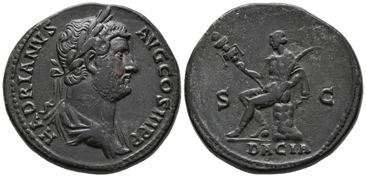 ADRIANO. Sestercio. (Ae. 27,13g/34mm). 134-138 d.C. Roma. Anv: HADRIANVS AVGVSTVS. Busto laureado y drapeado a derecha de Adriano. Rev: Dacia sentada sobre roca sosteniendo estandarte y espada curva, entre S-C, en exergo DACIA. (RIC 849). EBC-/MBC+. Retocado.