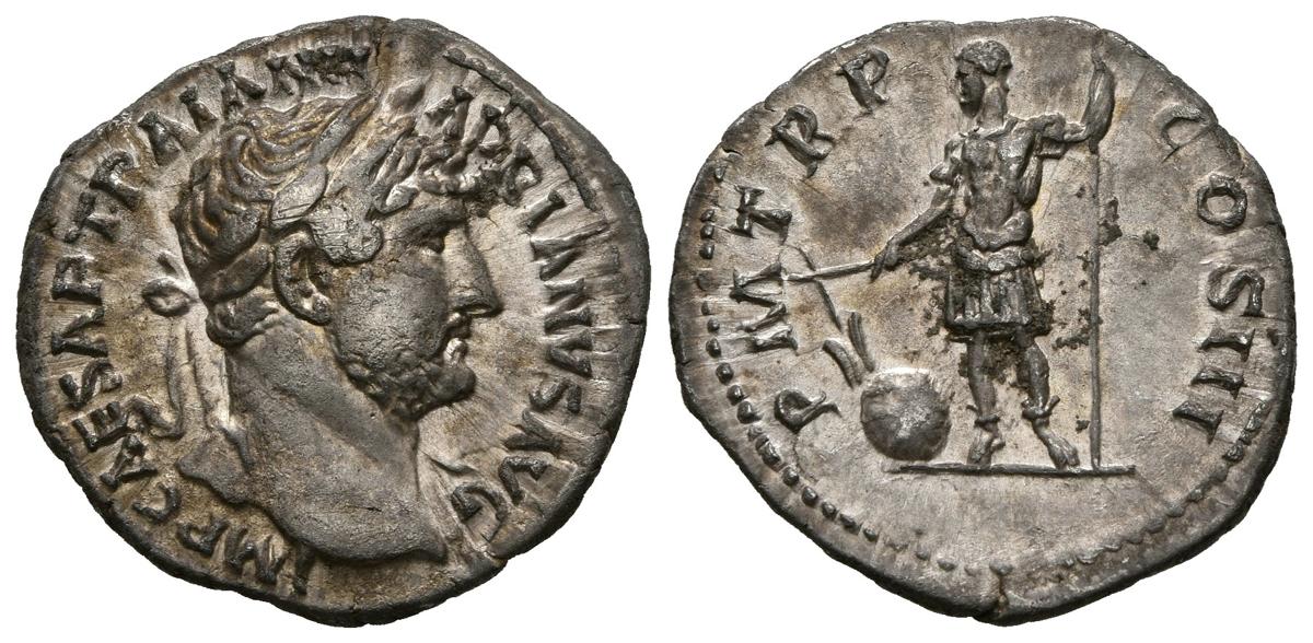 ADRIANO. Denario. (Ar. 3,04g/19mm). 119-122 d.C. Roma. Anv: IMP CAESAR TRAIAN HADRIANVS AVG. Busto laureado con ligero drapeado en hombro izquierdo a derecha de Adriano. Rev: P M TR P COS III. Adriano estante a izquierda portando cetro y timón sobre globo. (RIC 110). EBC. Bonito ejemplar escaso así.
