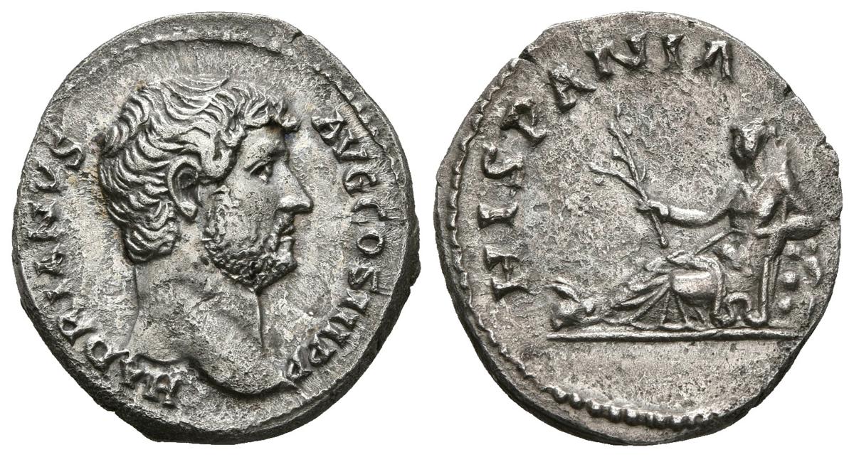 ADRIANO. Denario. (Ar. 2,81g/18mm). 130-133 d.C. Anv: HADRIANVS AVG COS III P P. Busto desnudo a derecha de Adriano. Rev: HISPANIA. Hispania tumbada a izquierda portando rama de olivo en la mano izquierda, y apoyando codo derecho en roca, delante conejo. (RIC 306). EBC-. Precioso y rarísimo ejemplar en esta espectacular calidad.
