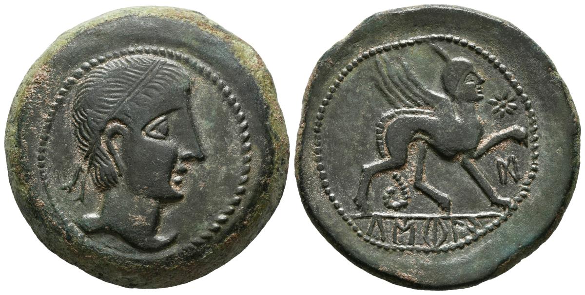 CASTULO (Cazlona, Jaén). As. (Ae. 27,17g/33mm). 180 a.C. Anv: Cabeza masculina diademada a derecha. Rev: Esfinge a derecha con estrella y letra ibérica Co delante, debajo leyenda ibérica: CaSTeLE. (FAB-697). EBC. Retocado.