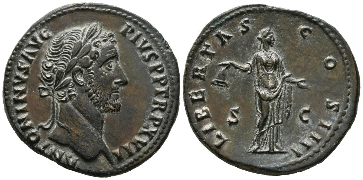 ANTONINO PIO. Sestercio. (Ae. 24,74g/33mm). 153-154 d.C. Roma. Anv: ANTONINVS AVG PIVS P P TR P XVII. Busto laureado a derecha de Antonino Pío. Rev: LIBERTAS COS IIII. Libertad estante a derecha portando píleo, entre S-C. (RIC 916a). EBC-. Retocado.