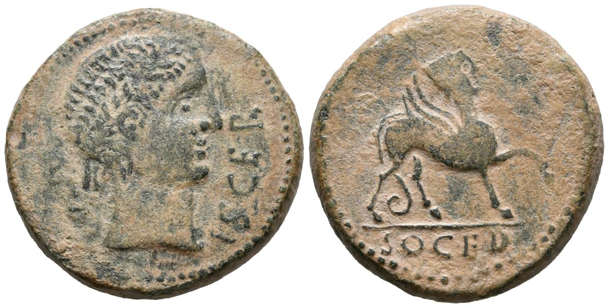 CASTULO (Cazlona, Jaén). As. (Ae. 20,10g/31mm). 180 a.C. Anv: Cabeza masculina laureada a derecha, alrededor: SACAL ISCER. Rev: Esfinge a derecha, delante leyenda: CAST, debajo: SOCED. (FAB-709). MBC+. Escaso.