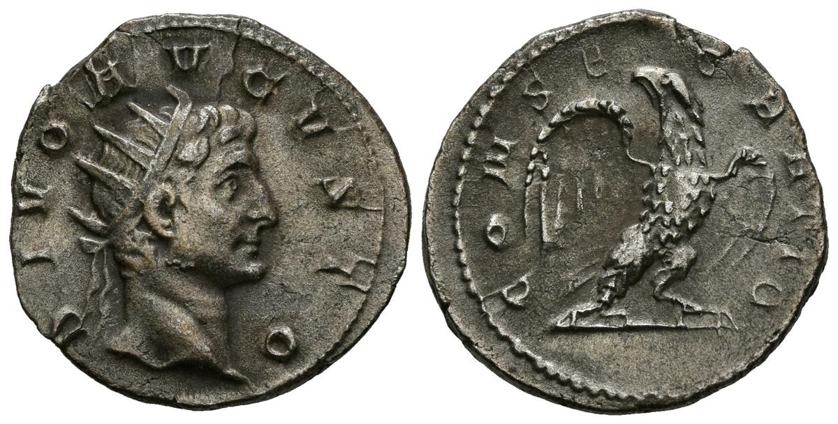 TRAJANO DECIO, acuñación conmemorativa de Divo Augusto. Antoniniano. (Ar. 3,26g/21mm). 249-251 d.C. Roma. Anv: DIVO AVGVSTO. Busto radiado a derecha de Divo Augusto. Rev: CONSECRATIO. Aguila estante mirando a izquierda. (RIC 77). EBC+. Muy raro ejemplar en esta espectacular calidad.