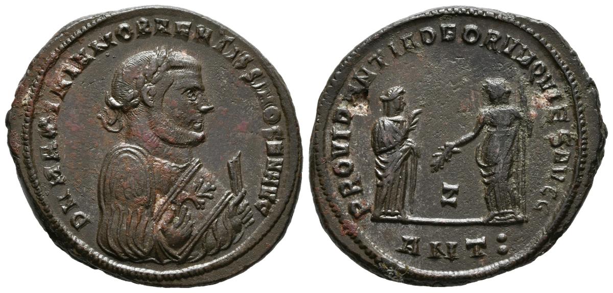 MAXIMIANO, Hércules. Follis. (Ae. 11,19g/29mm). 306 d.C. Antioquía. Anv: DN MAXIMIANO FELICISSIMO SEN AVG. Busto laureado drapeado y con coraza a derecha de Maximiano sosteniendo rama de olivo y mapa. Rev: PROVIDENTIA DEORVM QVIES AVGG. Providencia estante a derecha recibiendo rama de olivo de Quies estante a izquierda portando cetro, entre ellos Z, en exergo ANT:. (RIC 77a). EBC-. Bonito y escaso ejemplar.