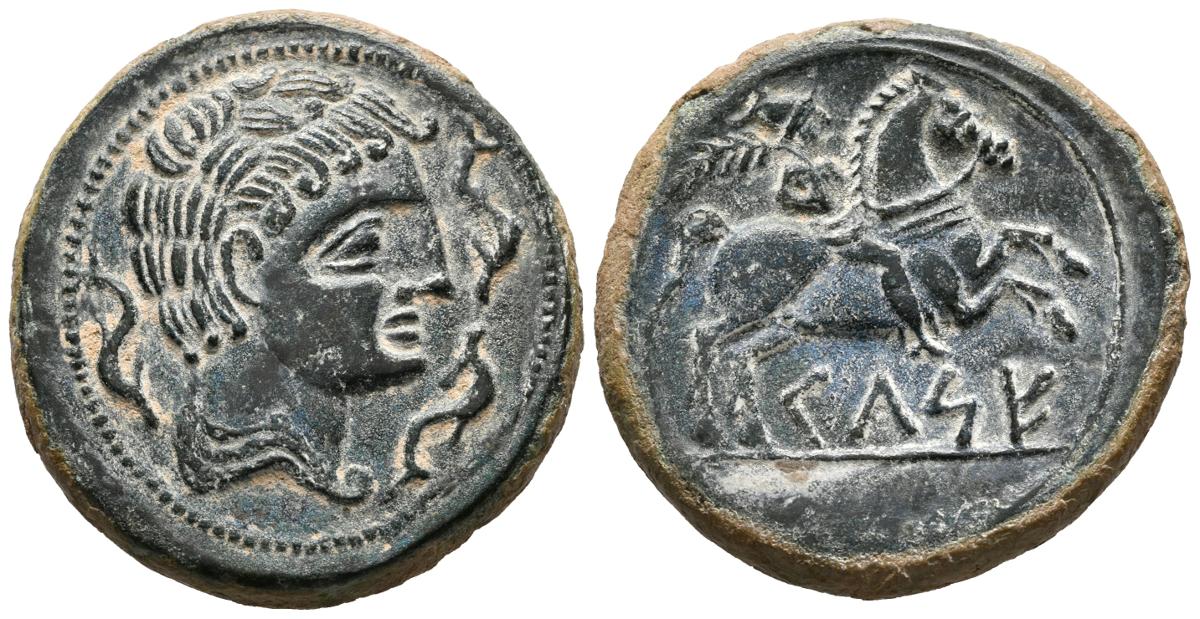 CELSE (Velilla del Ebro, Zaragoza). As. (Ae. 17,32g/30mm). 120-50 a.C. Anv: Cabeza masculina a derecha con manto y fíbula, alrededor tres delfines. Rev: Jinete con palma a derecha, debajo leyenda ibérica: CeLSE. (FAB-771). MBC+. Retocado.