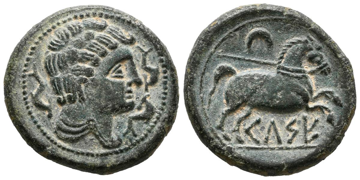 CELSE (Velilla del Ebro, Zaragoza). Semis. (Ae. 7,81g/23mm). 120-50 a.C. Anv: Cabeza masculina a derecha, alrededor tres delfines. Rev: Caballo a derecha, encima creciente, debajo leyenda ibérica: CeLSE. (FAB-782). MBC+. Pátina contemporánea.