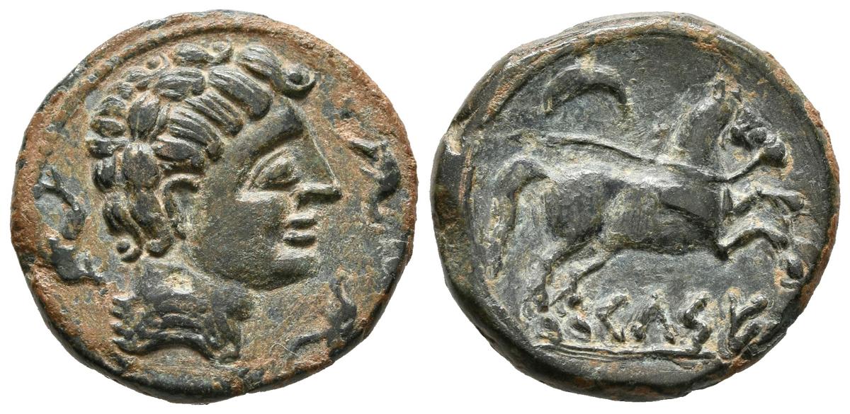 CELSE (Velilla del Ebro, Zaragoza). Semis. (Ae. 4,66g/20mm). 120-50 a.C. Anv: Cabeza masculina a derecha, alrededor tres delfines. Rev: Caballo a derecha, encima creciente, debajo leyenda ibérica: CeLSE. (FAB-782). MBC.