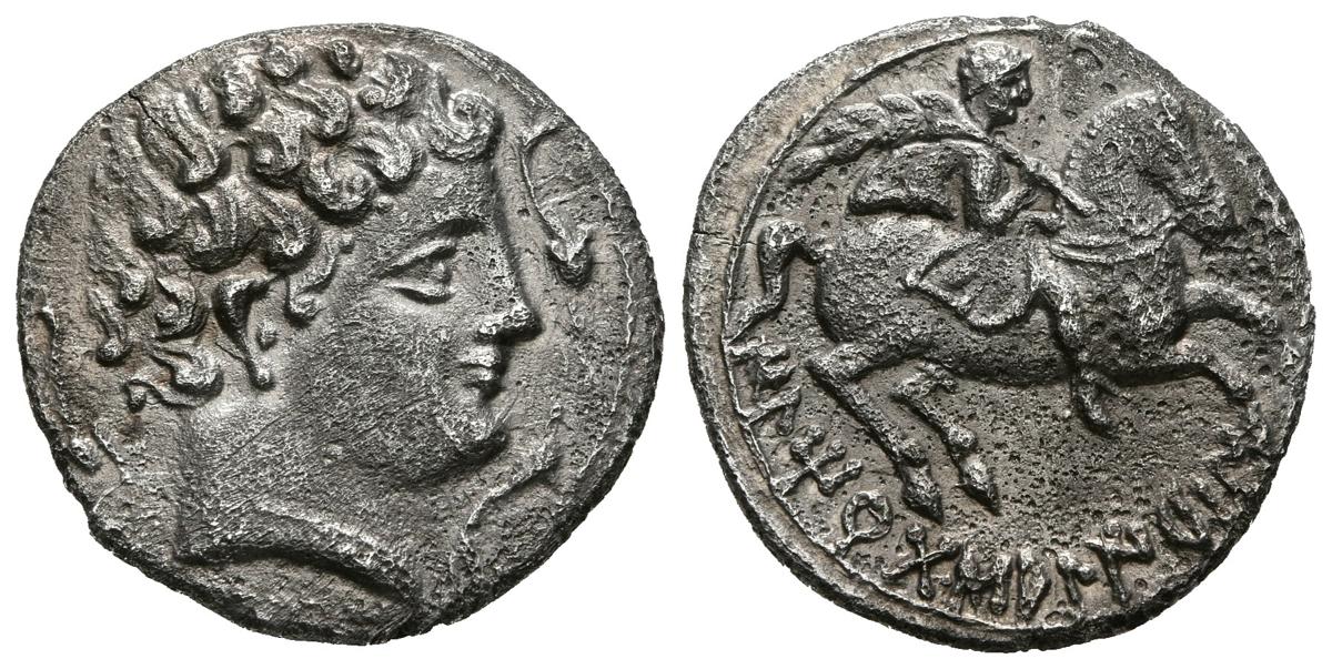 ILTIRTASALIRBAN (Lérida). Denario. (Ar. 3,61g/19mm). 200-20 a.C. Anv: Cabeza masculina rodeada de tres delfines a derecha. Rev: Jinete con palma y clámide a derecha, debajo leyenda ibérica: ILTiRTaSALIRBaN. (FAB-1455). MBC+. Oxidaciones limpiadas. Rara.La moneda de Iltirta es una de las de más amplia difusión por toda la península. De carácter indoeuropeo, la primera aparición en la historia de este pueblo se remonta al 219 a.C. con la marcha de Aníbal contra Roma cruzando el Ebro. Más tarde aparecerán como aliado de los cartagineses. Desde el punto de vista numismático, después de las emisiones de los dracmas de imitación emporitana y de los divisores de imitación massolita, Ilerda inicia la acuñación dentro de la organización romana usando la leyenda ibérica ILTIRTA, con una primera emisión de moneda de bronce con tipo de lobo y la metrología usada en Tarraco-Cese. Durante el siglo II a.C. se produce un cambio importante pasando a acuñar sólo monedas con el tipo del jinete, pero al llegar la época de las guerras sertorianas (80-72 a.C.) vuelve a pasar bajo la influencia de Cese, y a usar el tipo del lobo y el peso bajo de aquellas emisiones. Finalmente acaba acuñando emisiones toscas, de peso bajo, siempre con el tipo del lobo.