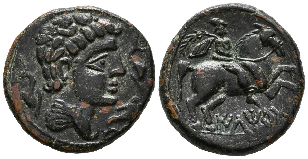 ILTIRTA (Lérida). As. (Ae. 9,62g/25mm). 200-20 a.C. Anv: Cabeza masculina rodeada de tres delfines a derecha. Rev: Jinete con palma y clámide a derecha, debajo leyenda ibérica: ILTiRTa. (FAB-1465). MBC+.