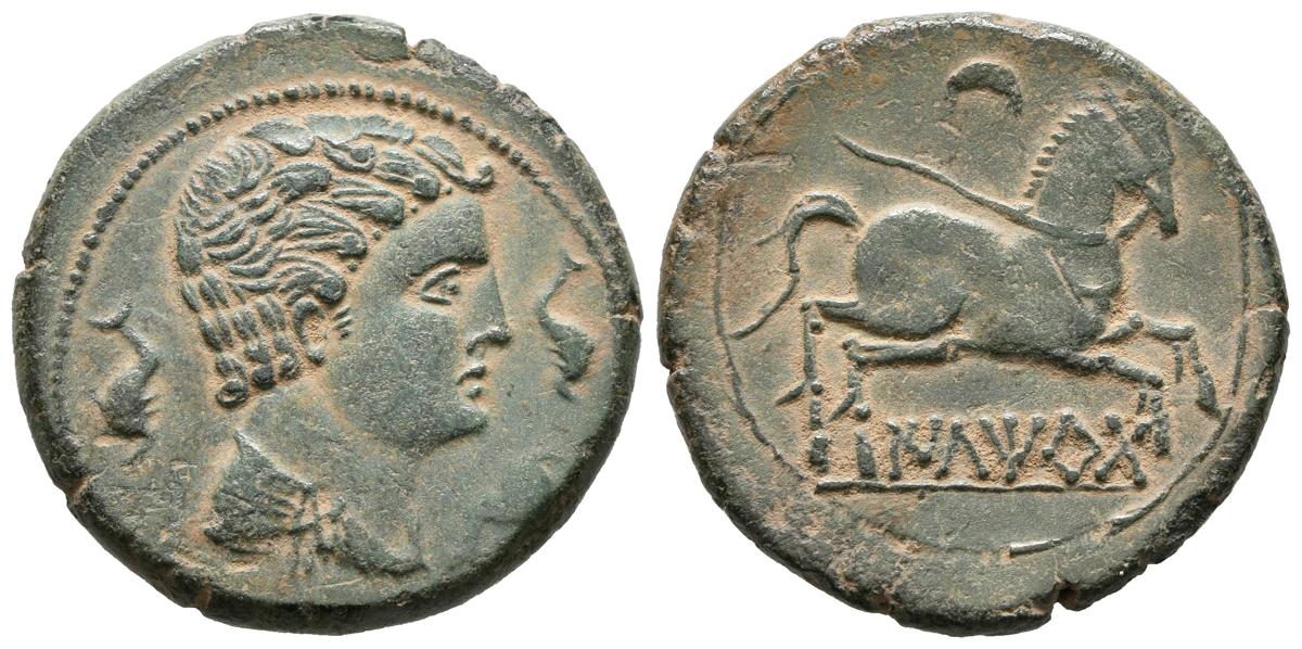 ILTIRTA (Lérida). Semis. (Ae. 7,96g/25mm). 200-20 a.C. Anv: Cabeza masculina rodeada de tres delfines a derecha. Rev: Caballo a derecha, encima creciente, debajo leyenda ibérica: ILTiRTa. (FAB-1466). EBC.