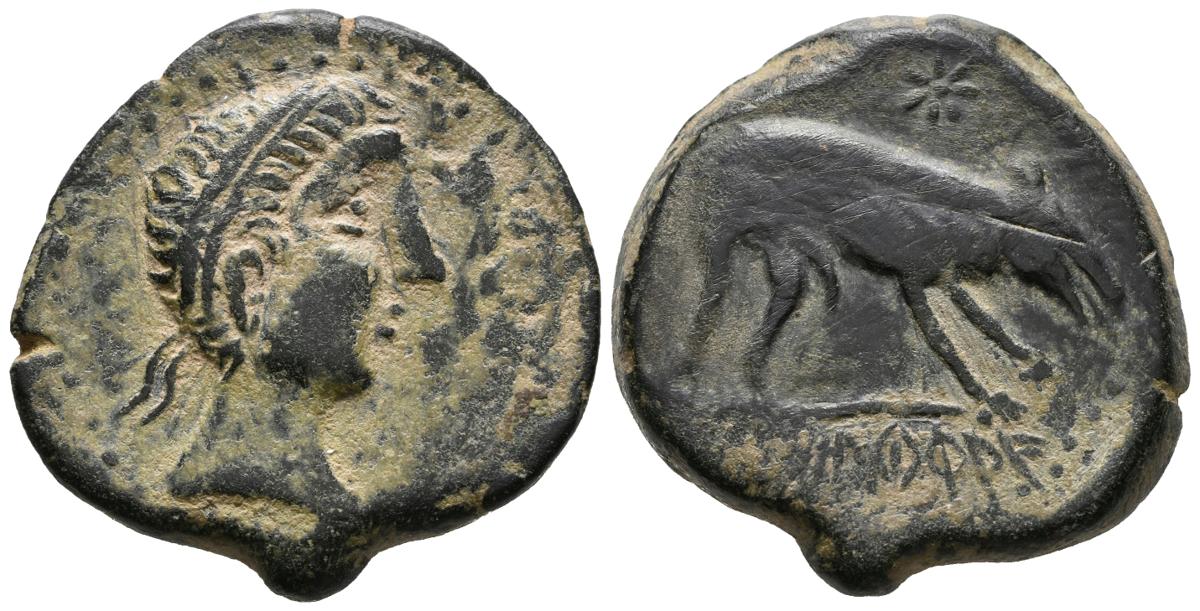ILTERACA (Sur peninsular). As. (Ae. 19,71g/30mm). 80-20 a.C. Anv: Cabeza masculina a derecha. Rev: Lobo a derecha, encima palma, debajo leyenda ibérica ILTeRACa. (FAB-1564). MBC+. Reverso retocado. Rarísimo ejemplar.