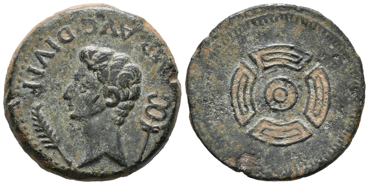 LUCO AUGUSTI (Lugo). As. (Ae. 9,59g/25mm). 27 a.C.-14 d.C. Anv: Cabeza desnuda de Augusto a izquierda, detrás caduceo, delante palma, alrededor: IMP. AVG. DIVI. F. Rev: Rodela de frente sin reborde. (FAB-1706). MBC+. Escasa.