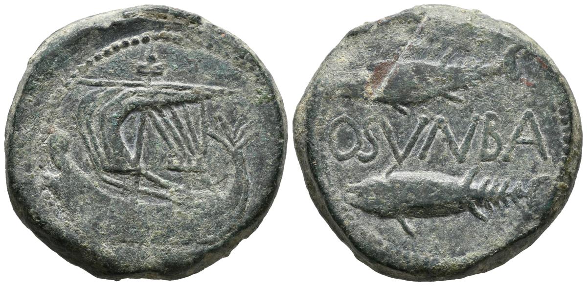 OSONUBA (Faro, Portugal). As. (Ae. 30,55g/33mm). 50 a.C. Anv: Nave a izquierda. Rev: Dos atunes a izquierda, entre ambos leyenda: OSVNBA. (FAB-1962). MBC+. Rarísimo y muy bonito ejemplar.Ubicada en Faro, capital del Algarve portugués, las acuñaciones de esta ciudad turdetana y fronteriza con Tartesos que conocemos son de una extraordinaria rareza y sólo están constatadas cuando la ciudad pertenecía a la Ulterior, en un momento preimperial. Presentan sus monedas, una nave y en la cara opuesta el topónimo entre dos atunes (este emplazamiento tenía en los salazones de pescado una de sus principales industrias) También existen pequeñas teseras de plomo, con un pez y debajo, en ocasiones, la palabra Oso.
