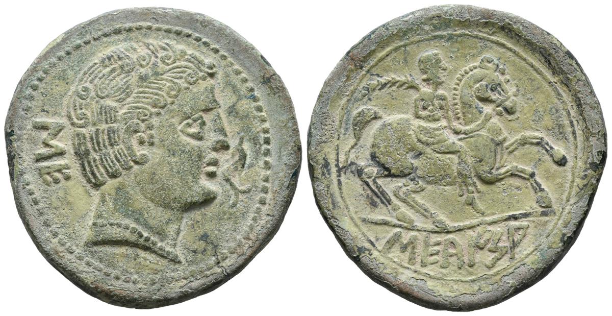 SECAISA (Zona de Aragón). As. (Ae. 20,79g/32mm). 120-20 a.C. Anv: Cabeza masculina a derecha, delante delfín, detrás letras ibéricas: SE. Rev: Jinete con palma a derecha, debajo leyenda ibérica: SECaISA. (FAB-2121). EBC-. Pátina contemporánea.