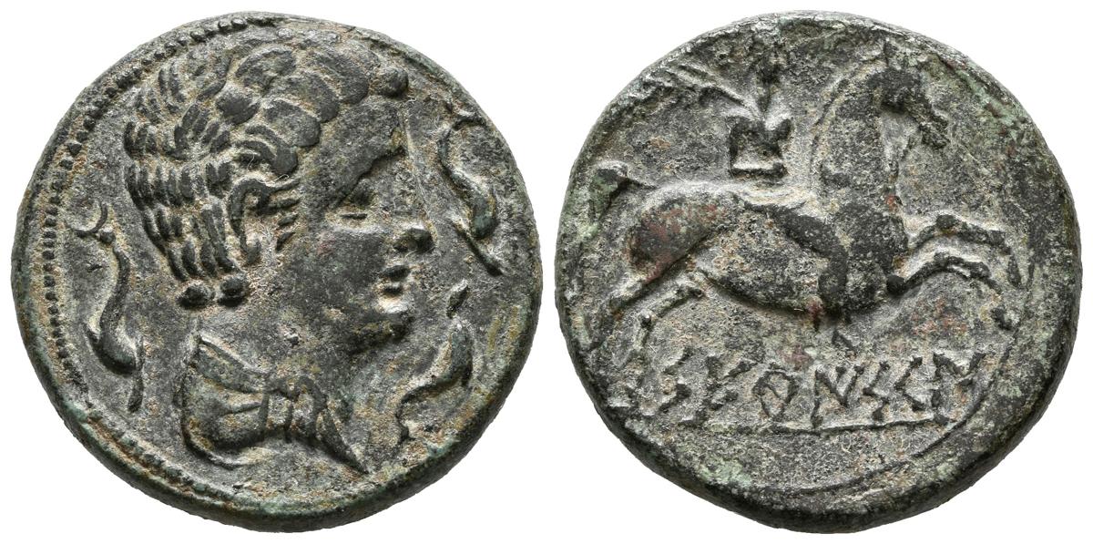 SETEISCEN (Sástago, Zaragoza). Semis. (Ae. 9,48g/24mm). 120-20 a.C. Anv: Cabeza masculina a derecha rodeada de tres delfines. Rev: Jinete con palma a derecha, debajo leyenda ibérica: SETeISCeN. (FAB-2206). EBC-.