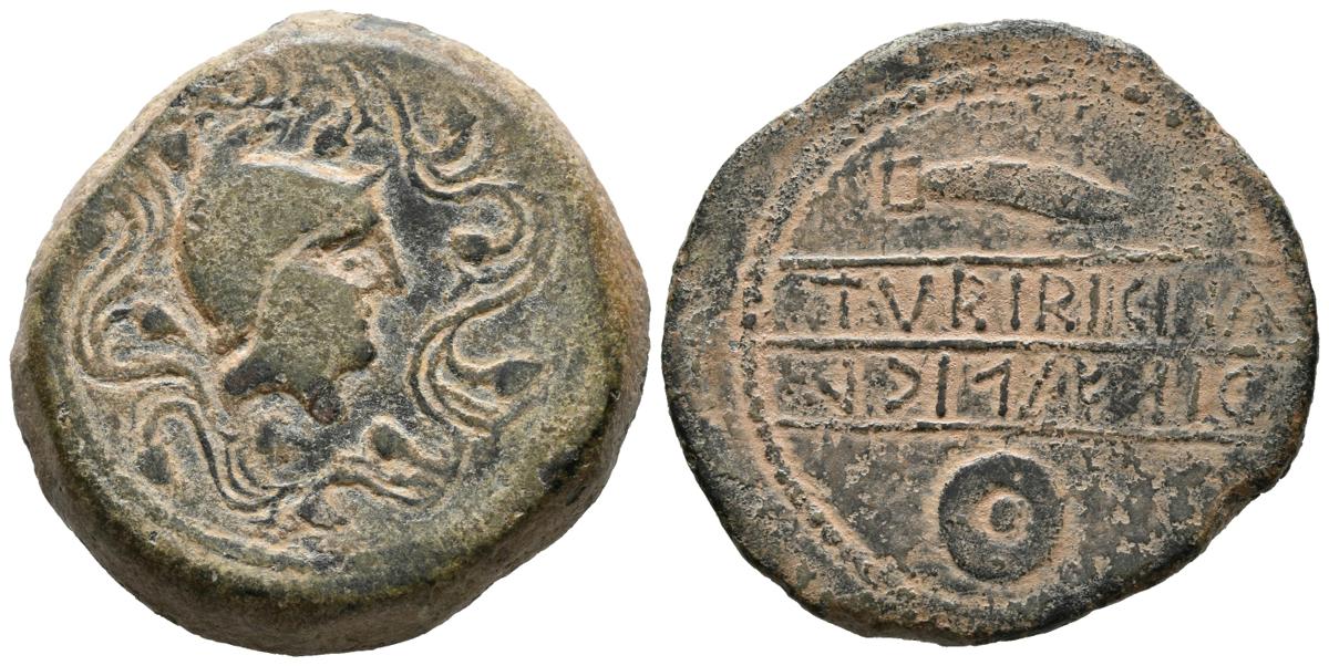 TURRIRREGINA (Casas de la Reina, Badajoz). As. (Ae. 22,94g/31mm). 50 a.C. Anv: Cabeza masculina con casco a derecha, alrededor tallos de vid. Rev: Falcata y rodela, entre ambos TVRIRIICINA y leyenda libio-fenicia. (FAB-2464). MBC+. Pátina contemporánea. Escasa.