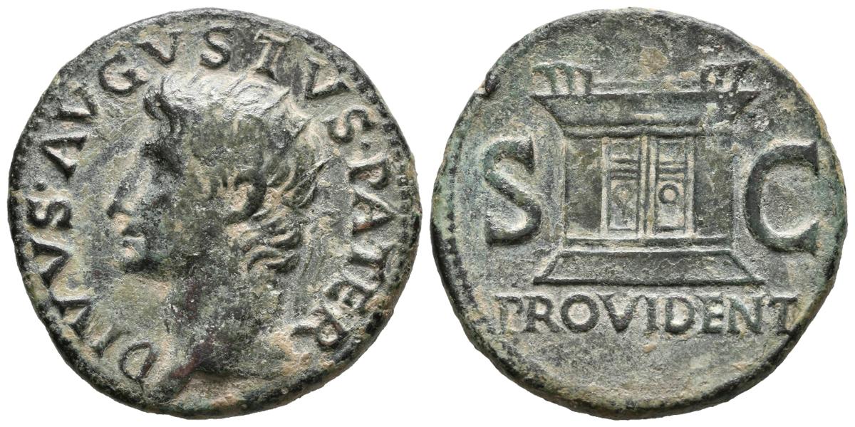DIVO AUGUSTO. As. (Ae. 10,66g/28mm). 22-30 d.C. Roma. Anv: DIVVS AVGVSTVS PATER. Rev: Altar cerrado por dos puertas, entre S-C, debajo PROVIDENT. (RIC 81). MBC+.