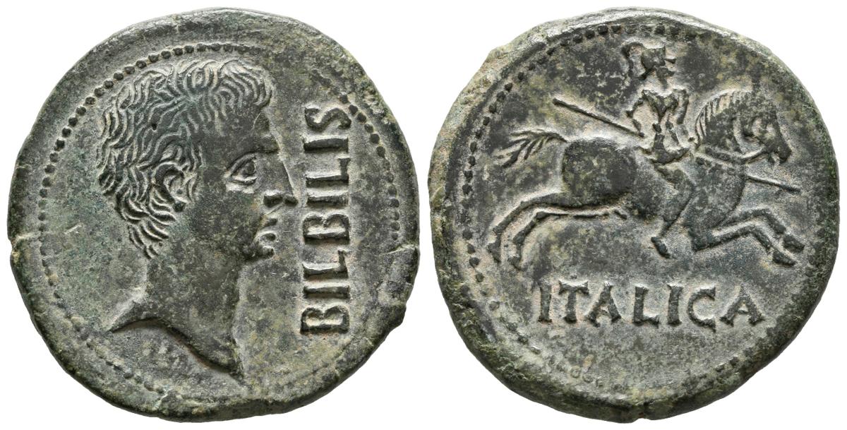 BILBILIS (Calatayud, Zaragoza). As. (Ae. 13,20g/30mm). 30-20 a.C. Anv: Cabeza de Augusto a derecha, delante BILBILIS. Rev: Jinete con lanza a derecha, debajo ITALICA sin línea. (FAB-270). EBC-. Parcialmente retocado. Escaso.