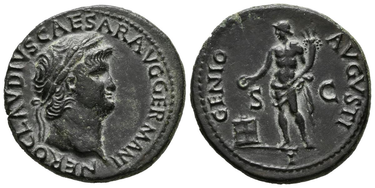 NERON. As. (Ae. 7,25g/24mm). 64 d.C. Roma. Anv: NERO CLAVDIVS CAESAR AVG GERMANI. Busto laureado a derecha de Nerón. Rev: GENIO AVGVSTI. Genio estante a izquierda portando cornucopia y patera sobre altar, entre S-C. (RIC 214). MBC+. Retocado.