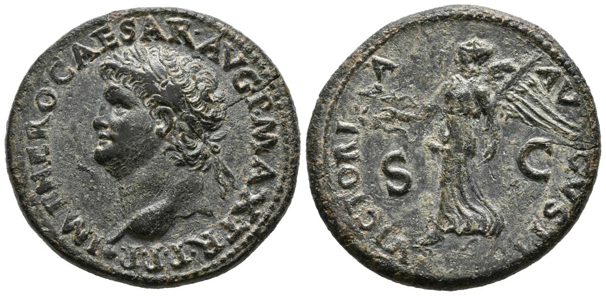 NERON. Dupondio. (Ae. 14,33g/30mm). 68 d.C. Roma. Anv: IMP NERO CAESAR AVG P MAX TR P P. Busto laureado a izquierda de Nerón. Rev: VICTORIA AVGVSTI. Victoria estante a izquierda portando palma y corona, entre S-C. (RIC 523). EBC-.