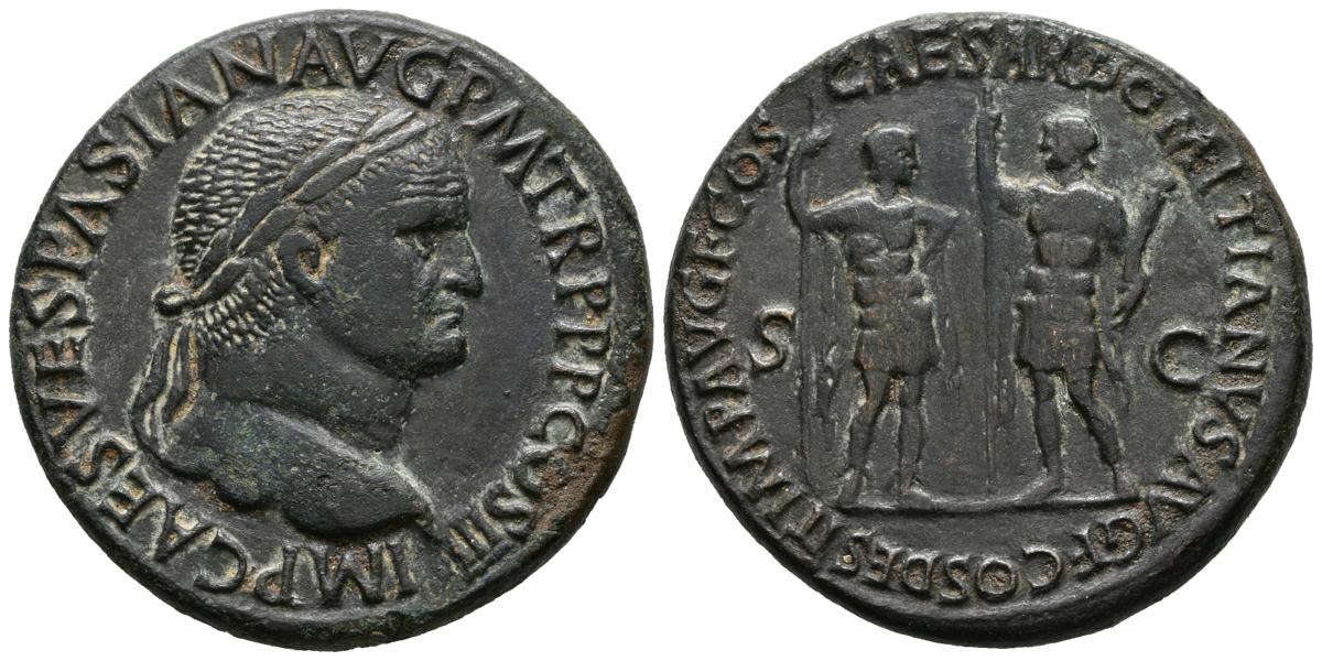 VESPASIANO. Sestercio. (Ae. 20,01g/34mm). 72 d.C. Lugdunum. Anv: IMP CAES VESPASIAN AVG P M TR P P P COS III. Busto laureado a derecha. Rev: CAESAR AVG F DES IMP AVG F COS DES IT. Tito y Domiciano estantes de frente ambos sosteniendo lanza y daga, entre S-C. (RIC 143). MBC-. Retocado. Raro.