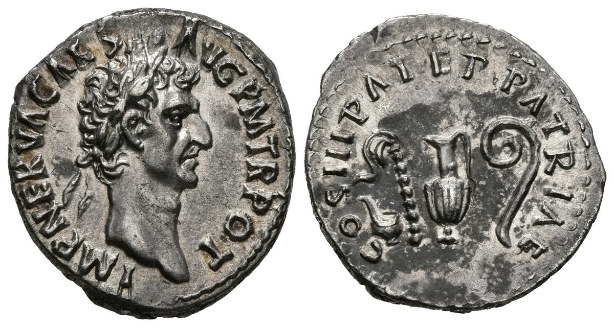 NERVA. Denario. (Ar. 3,29g/19mm). 97 d.C. Roma. Anv: IMP NERVA CAES AVG P M TR POT. Busto laureado de Nerva a derecha. Rev: COS III PATER PATRIAE. Elementos religiosos: Símpulo, aspérgilo, guttus y lítuo. (RIC 24). EBC+. Excepcional ejemplar rarísimo en esta calidad.Entre los gobiernos de Domiciano y Trajano se sitúa Nerva, quién en sólo dos años mejoró considerablemente las relaciones con el Senado e implantó la sucesión imperial en lugar de hereditaria, siendo considerado, tradicionalmente, como un modelo de virtudes cívicas. Una vez accedió al trono imperial, el Senado Romano aprobó un "dammatio memoriae" hacia Domiciano siendo sus monedas fundidas, sus estatuas derribadas y su nombre borrado de todo lugar público. Nerva es considerado por buena parte de la historiografía actual como uno de los llamados cinco buenos emperadores, nombre ya propuesto por el propio Maquiavelo y que engloba a cinco miembros de la dinastía Antonina como son, al margen del ya mencionado Nerva, Trajano, Adriano, Antonino Pío y Marco Aurelio.Respecto al retrato de sus monedas, se aprecia un claro realismo donde comprobamos, sin ambages, sus rasgos angulosos, acentuados por la delgadez y las huellas de la edad.