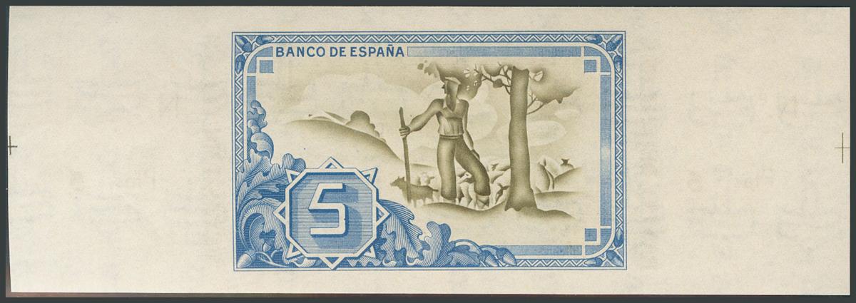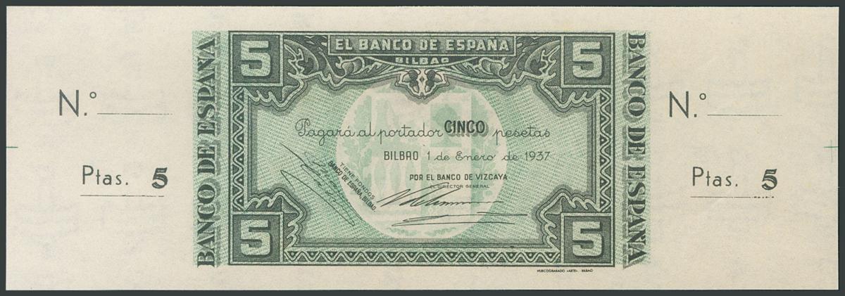 5 Pesetas. 1 de Enero de 1937. Sucursal de Bilbao, antefirma Banco de Vizcaya. Sin serie y sin numeración, con ambas matrices. (Edifil 2017: 385f). SC.
