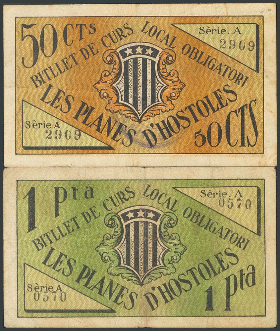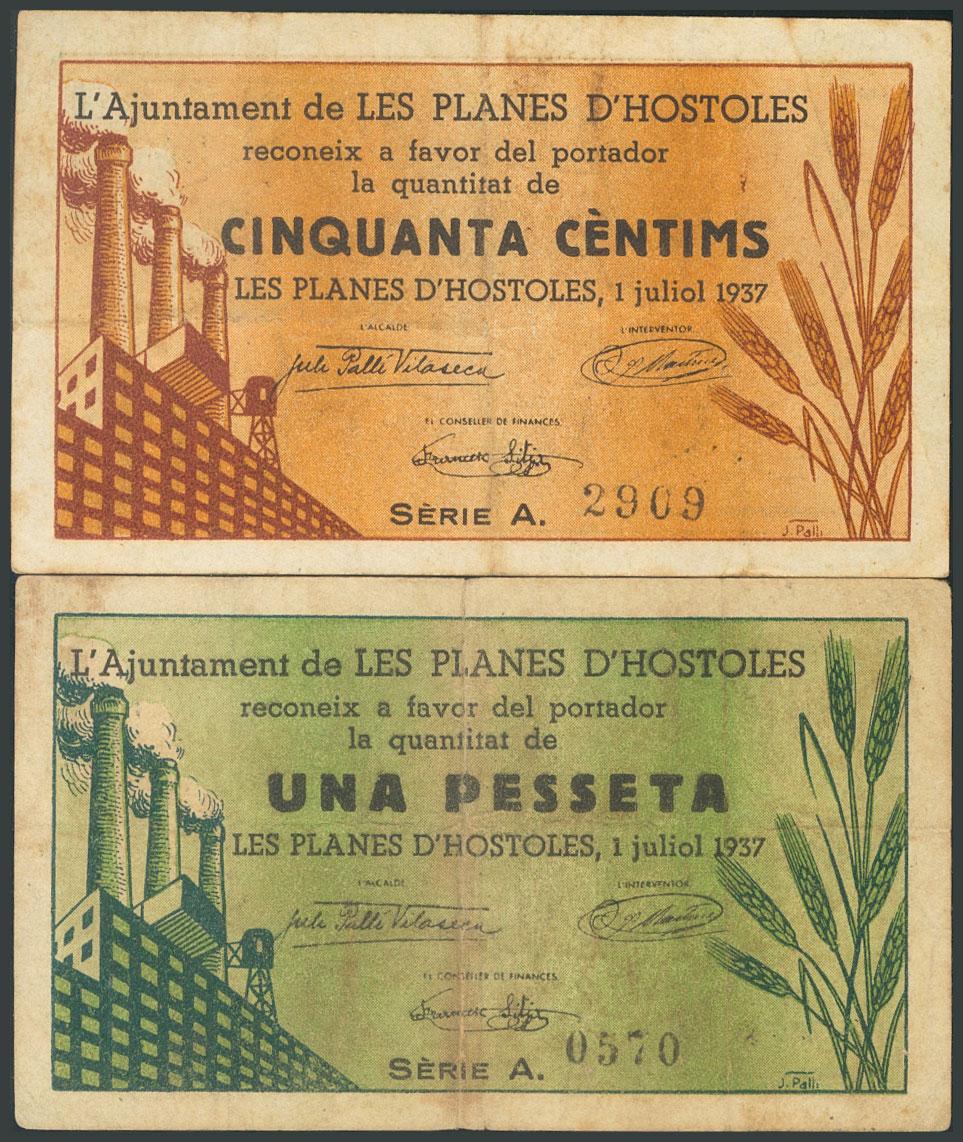 PLANES DE HOSTOLES (GERONA). 50 Céntimos y 1 Peseta. 1 de Julio de 1937. Serie A, ambos. (González: 9279/80). Serie completa. MBC.