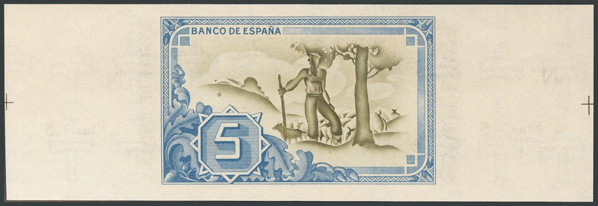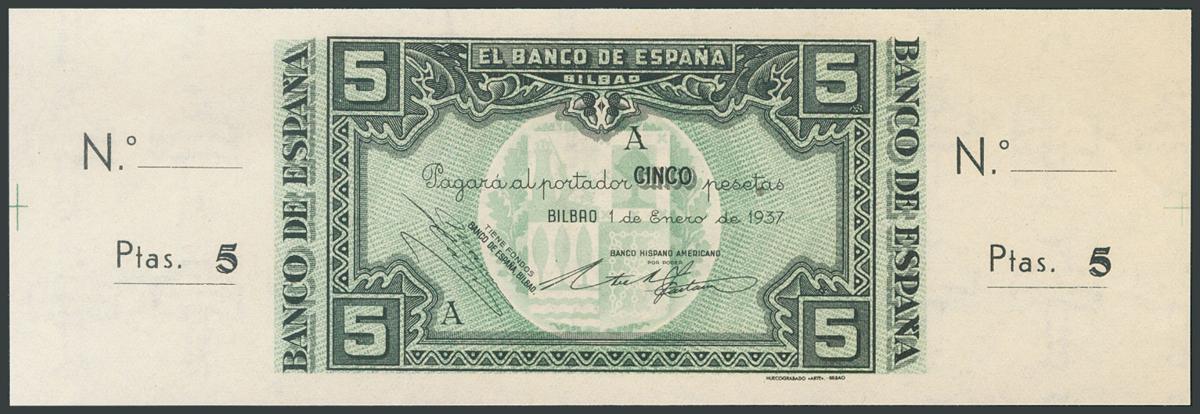 5 Pesetas. 1 de Enero de 1937. Sucursal de Bilbao, antefirma Banco Hispano Americano. Serie A y sin numeración, con ambas matrices. (Edifil 2017: 386a). SC.