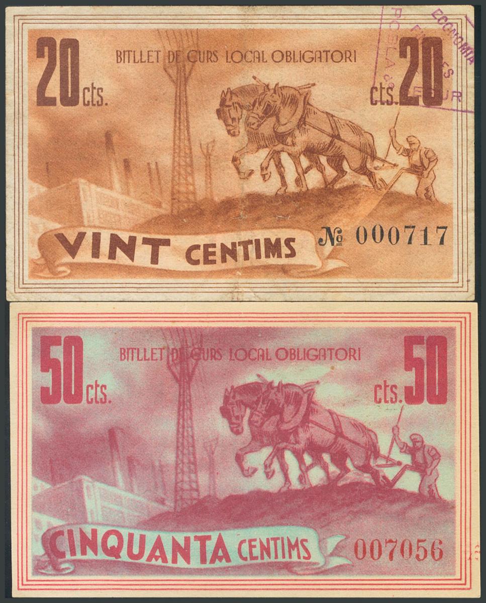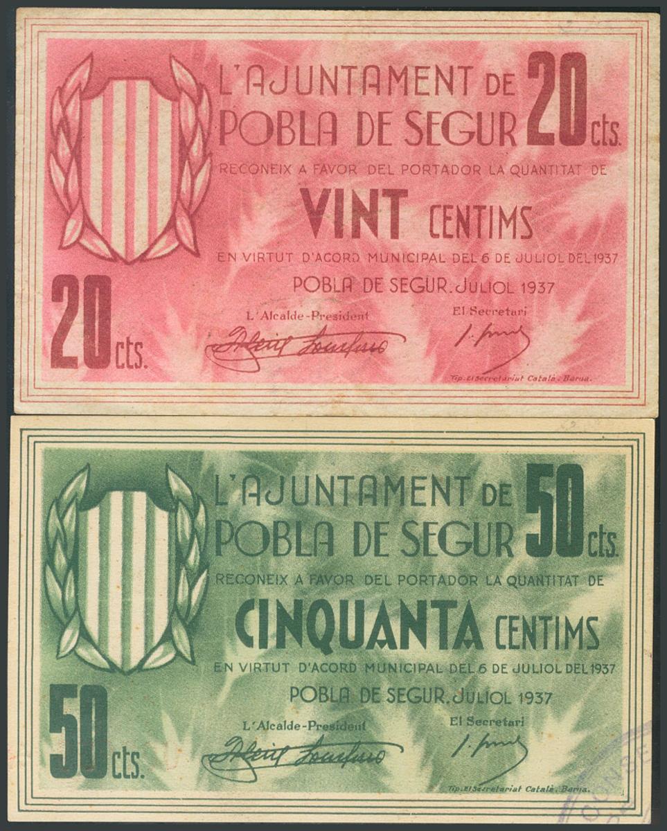 POBLA DE SEGUR (LERIDA). 20 Céntimos y 50 Céntimos. 6 de Julio de 1937. (González: 9339, 9340). MBC/EBC.