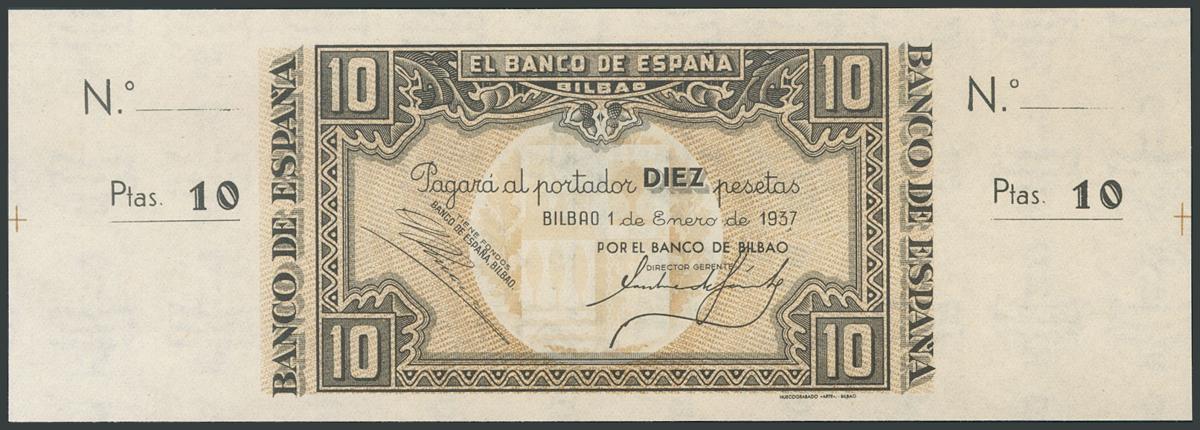 10 Pesetas. 1 de Enero de 1937. Sucursal de Bilbao, antefirma Banco de Bilbao. Sin serie y sin numeración, con ambas matrices. (Edifil 2017: 387a). SC.