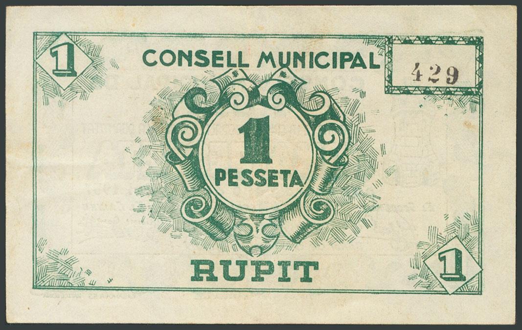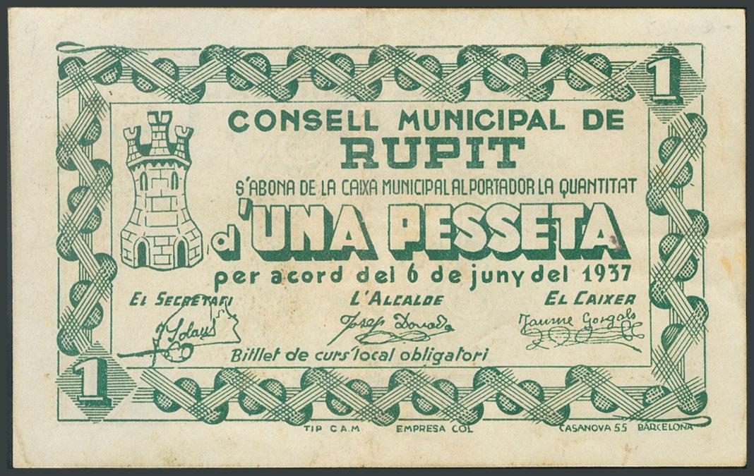 RUPIT (BARCELONA). 1 Peseta. Junio 1937. (González: 9775). Raro. MBC+.
