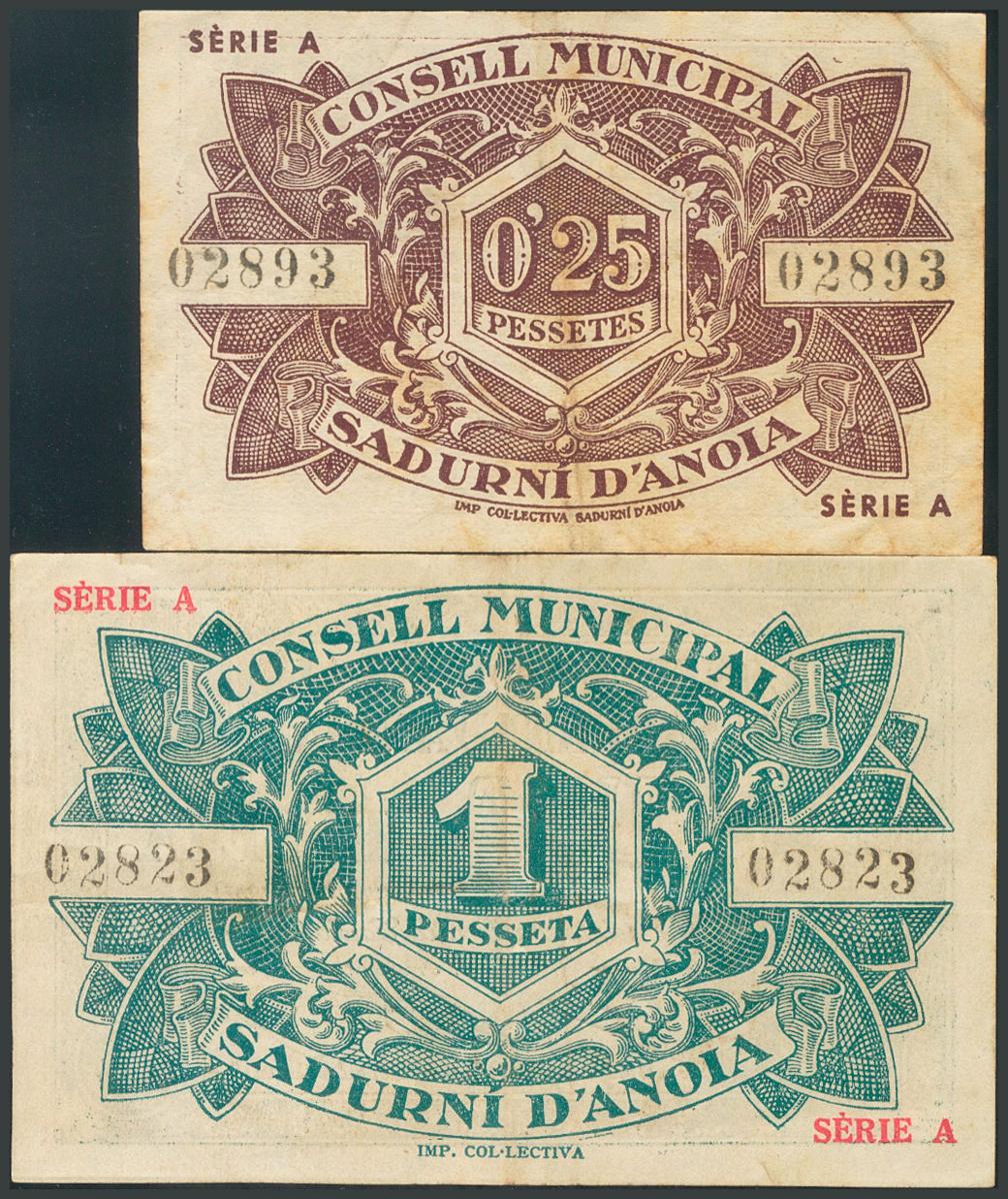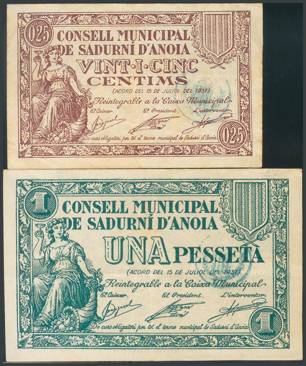 SADURNI DE ANOIA (BARCELONA). 25 Céntimos y 1 Peseta. 15 de Julio de 1937. Serie A, ambos. (González: 9804, 9806). MBC+.