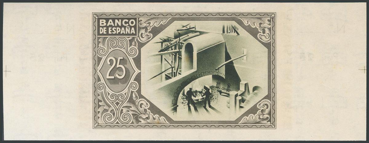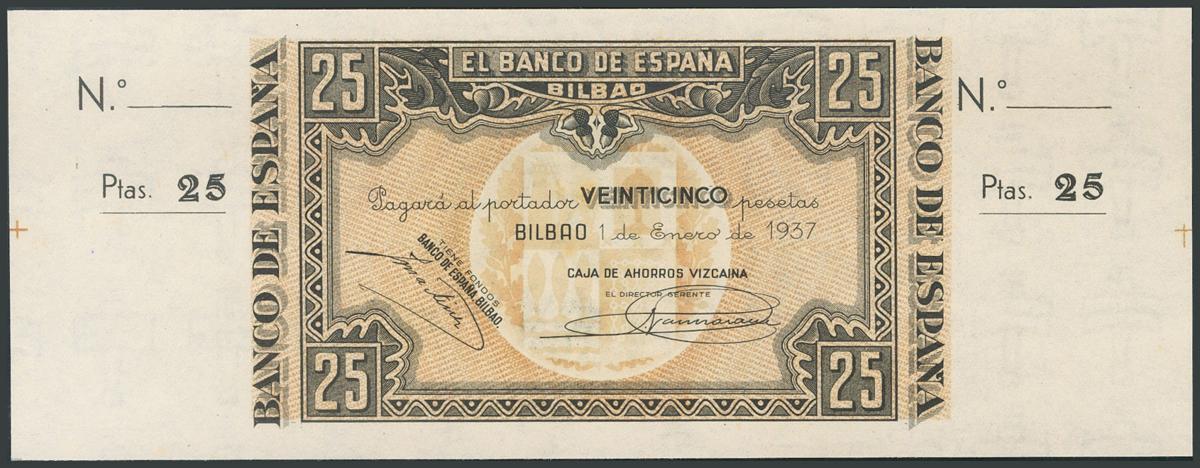 25 Pesetas. 1 de Enero de 1937. Sucursal de Bilbao, antefirma Caja de Ahorros Vizcaína. Sin serie y sin numeración, con ambas matrices. (Edifil 2017: 388a). SC.