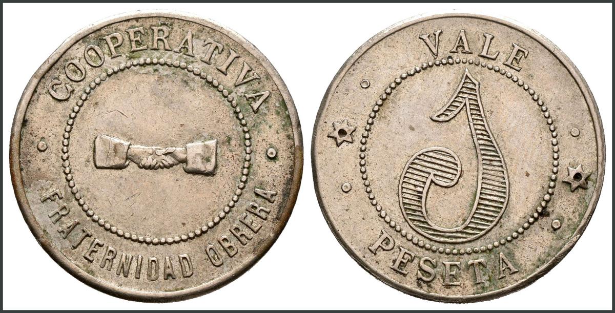 Vale-ficha por valor de 1 Peseta, emitido por la Cooperativa Fraternidad Obrera. MBC+.