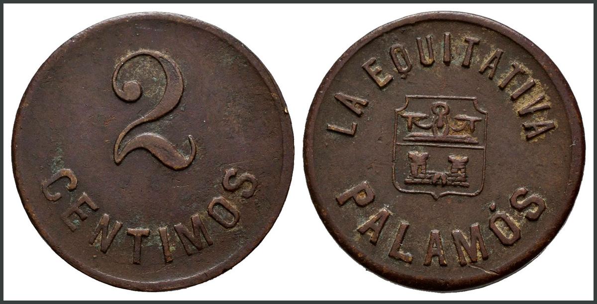 Ficha por valor de 2 Céntimos emitido por "La Equitativa", de Palamós. MBC+.