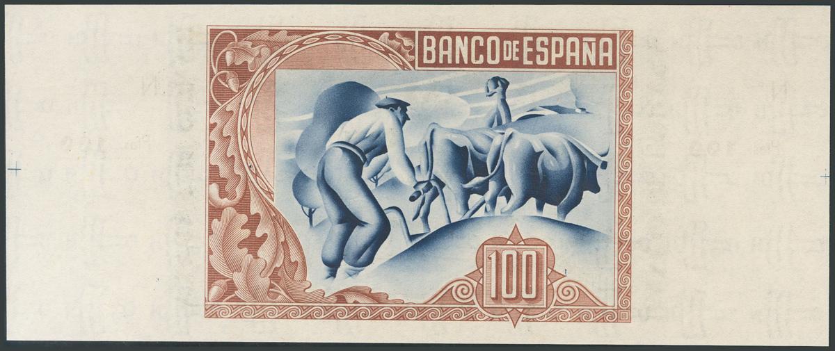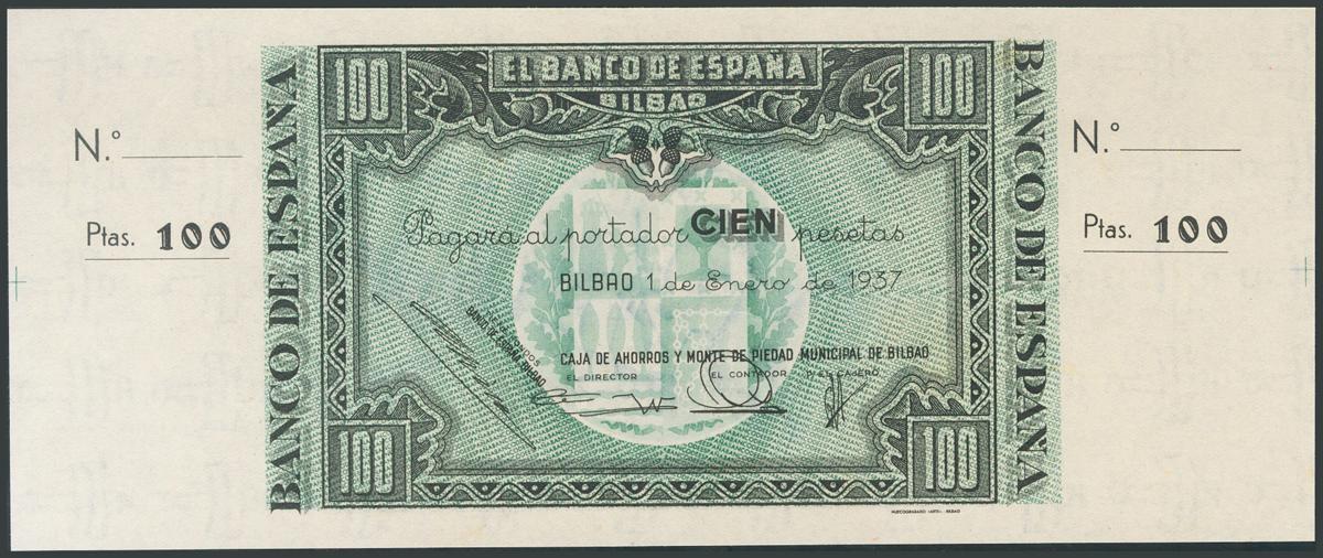 100 Pesetas. 1 de Enero de 1937. Sucursal de Bilbao, antefirma Caja de Ahorros y Monte de Piedad Municipal de Bilbao. Sin serie y sin numeración, con ambas matrices. (Edifil 2017: 390c). SC.