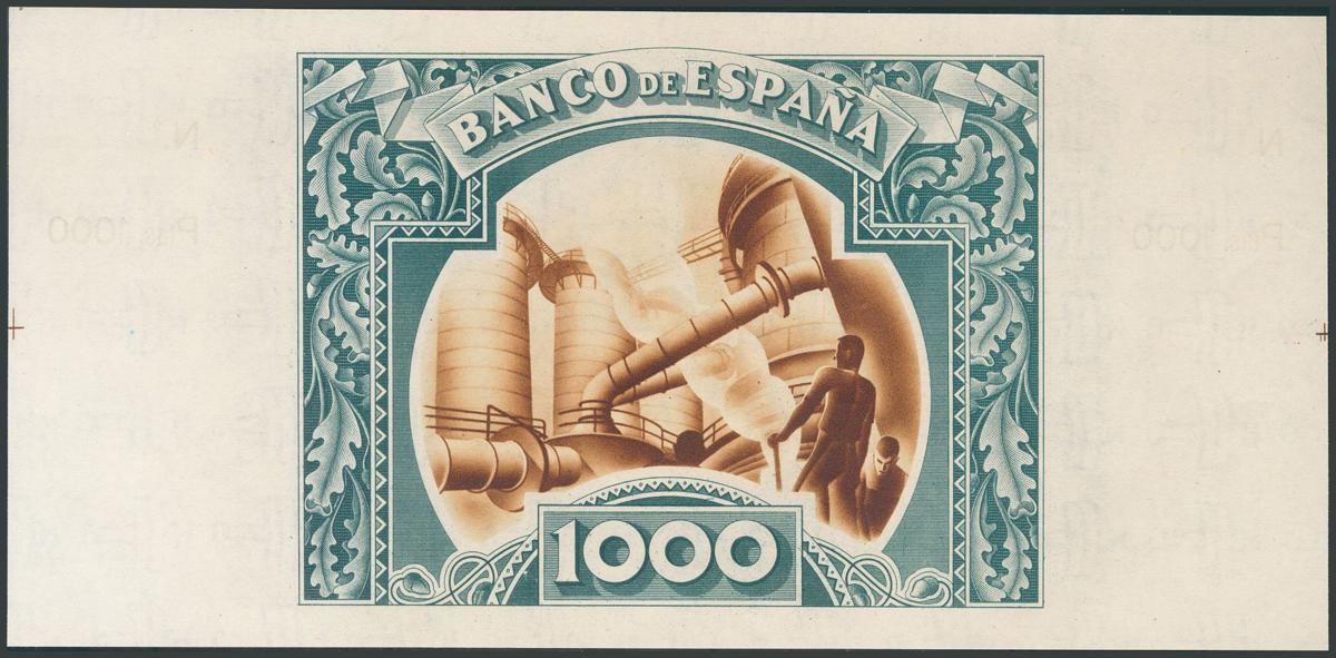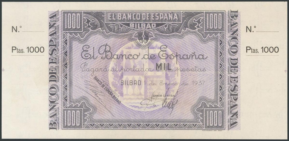 1000 Pesetas. 1 de Enero de 1937. Sucursal de Bilbao, antefirma Banco Central. Sin serie y sin numeración, con ambas matrices. (Edifil 2017: NE27b). SC-.