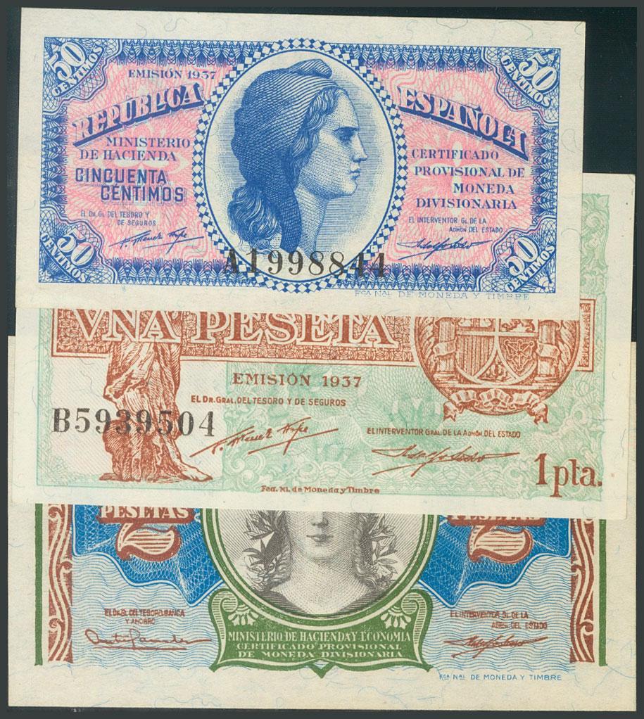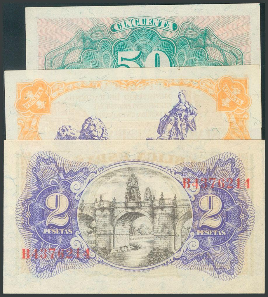 50 Céntimos, 1 Peseta y 2 Pesetas. 1937. Series A, B y B, respectivamente. (Edifil 2017: 391/93). Apresto original. SC.