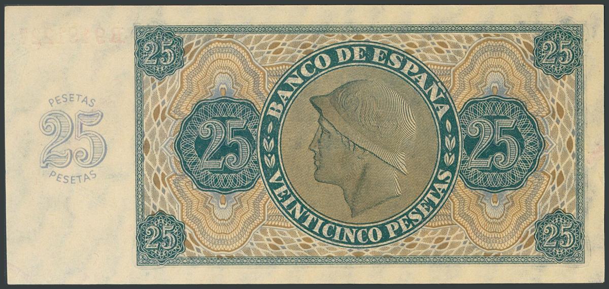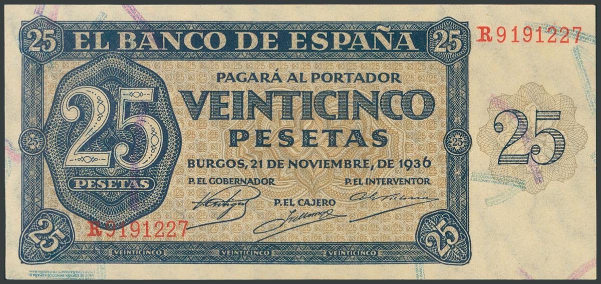 25 Pesetas. 21 de Noviembre de 1936. Serie R. (Edifil 2017: 419a). Apresto original. SC-.