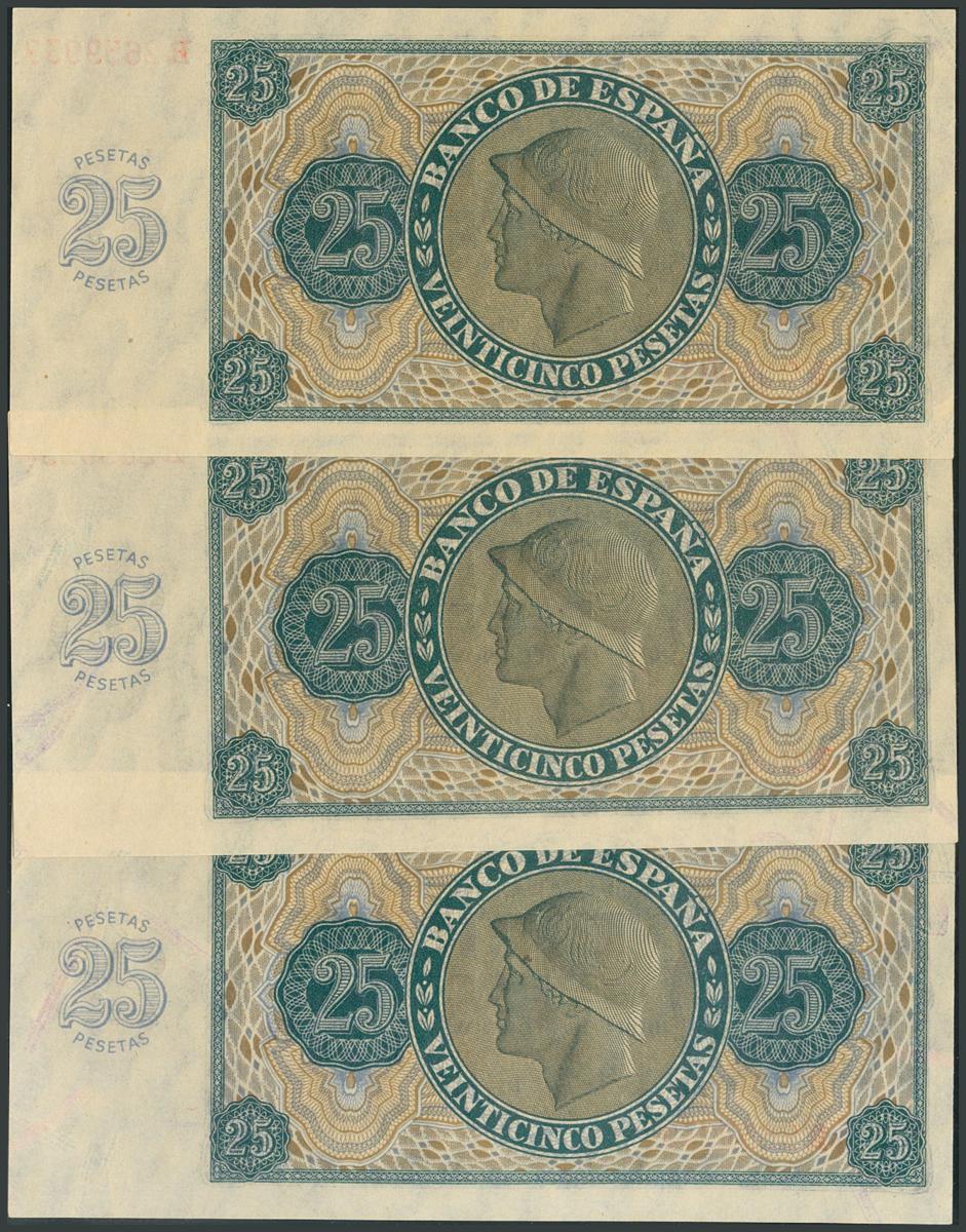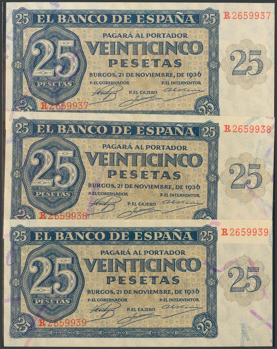 25 Pesetas. 21 de Noviembre de 1936. Trío correlativo. Serie R. (Edifil 2017: 419a). Apresto original. SC.