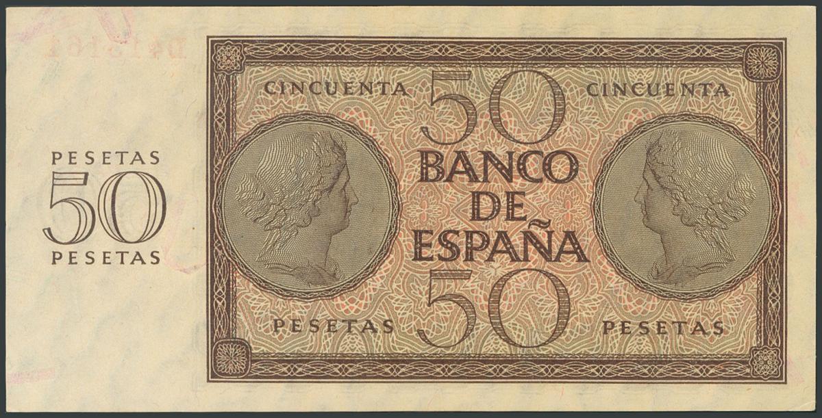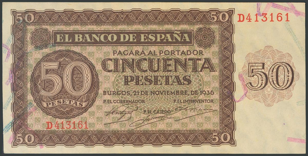 50 Pesetas. 21 de Noviembre de 1936. Serie D. (EDifil 2017: 420a). Inusual en esta calidad y apresto original, esquina inferior izquierda marcada. SC-.