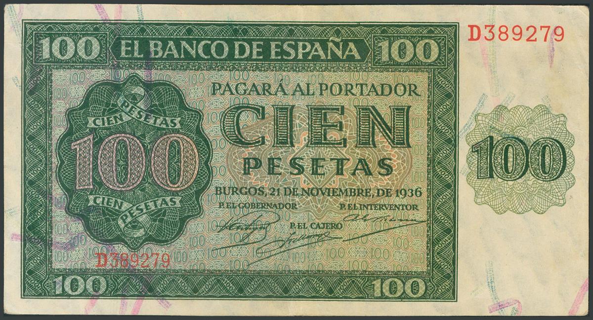100 Pesetas. 21 de Noviembre de 1936. Serie D. (Edifil 2017: 421a). MBC+.