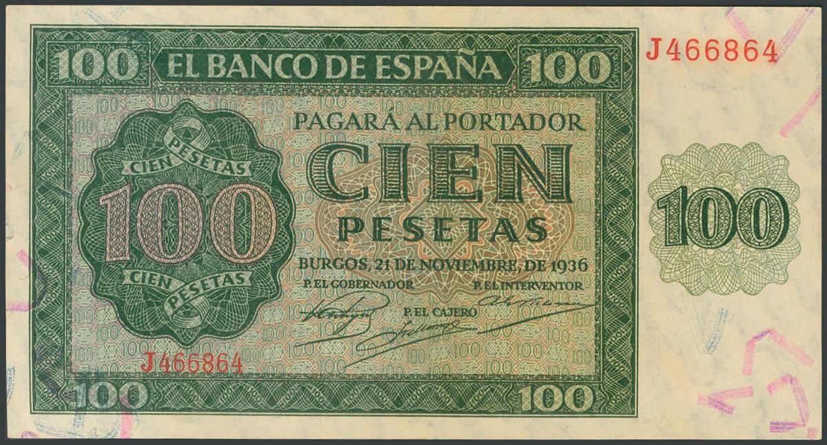 100 Pesetas. 21 de Noviembre de 1936. Serie J. (Edifil 2017: 421a). Apresto original. SC.