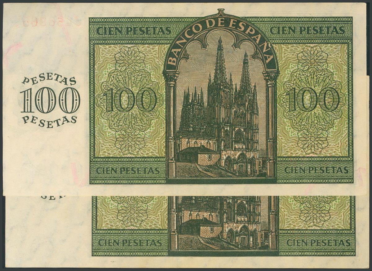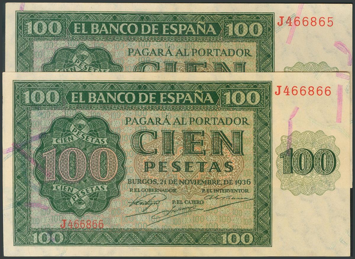 100 Pesetas. 21 de Noviembre de 1936. Pareja correlativa. Serie J. (Edifil 2017: 421a). Apresto original. SC.