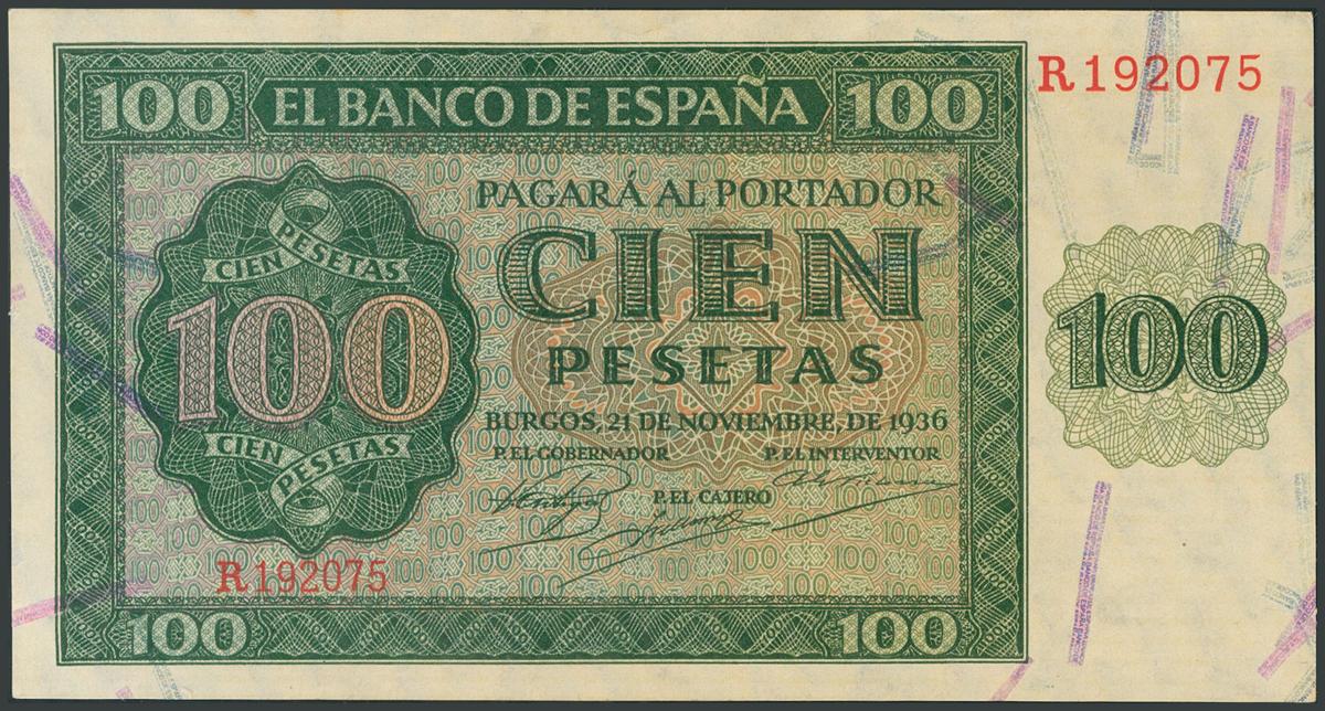 100 Pesetas. 21 de Noviembre de 1936. Serie R. (Edifil 2017: 421a). Apresto original. SC.