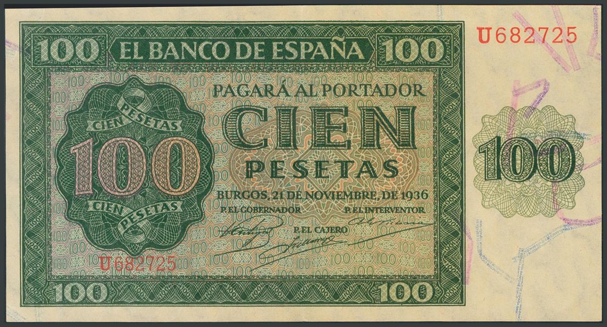 100 Pesetas. 21 de Noviembre de 1936. Serie U. (Edifil 2017: 421a). EBC.