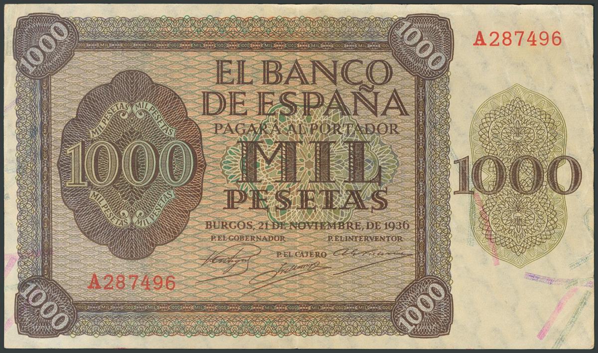 1000 Pesetas. 21 de Noviembre de 1936. Serie A. (Edifil 2017: 423). Inusual. MBC+.