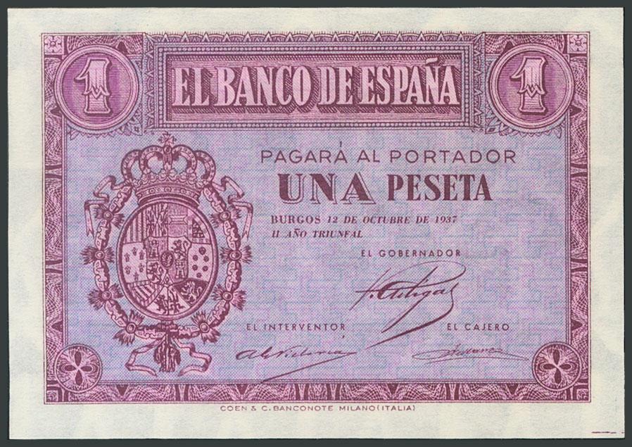 1 Peseta. 12 de Octubre de 1937. Serie A. (Edifil 2017: 425). Inusual y apresto original. SC.