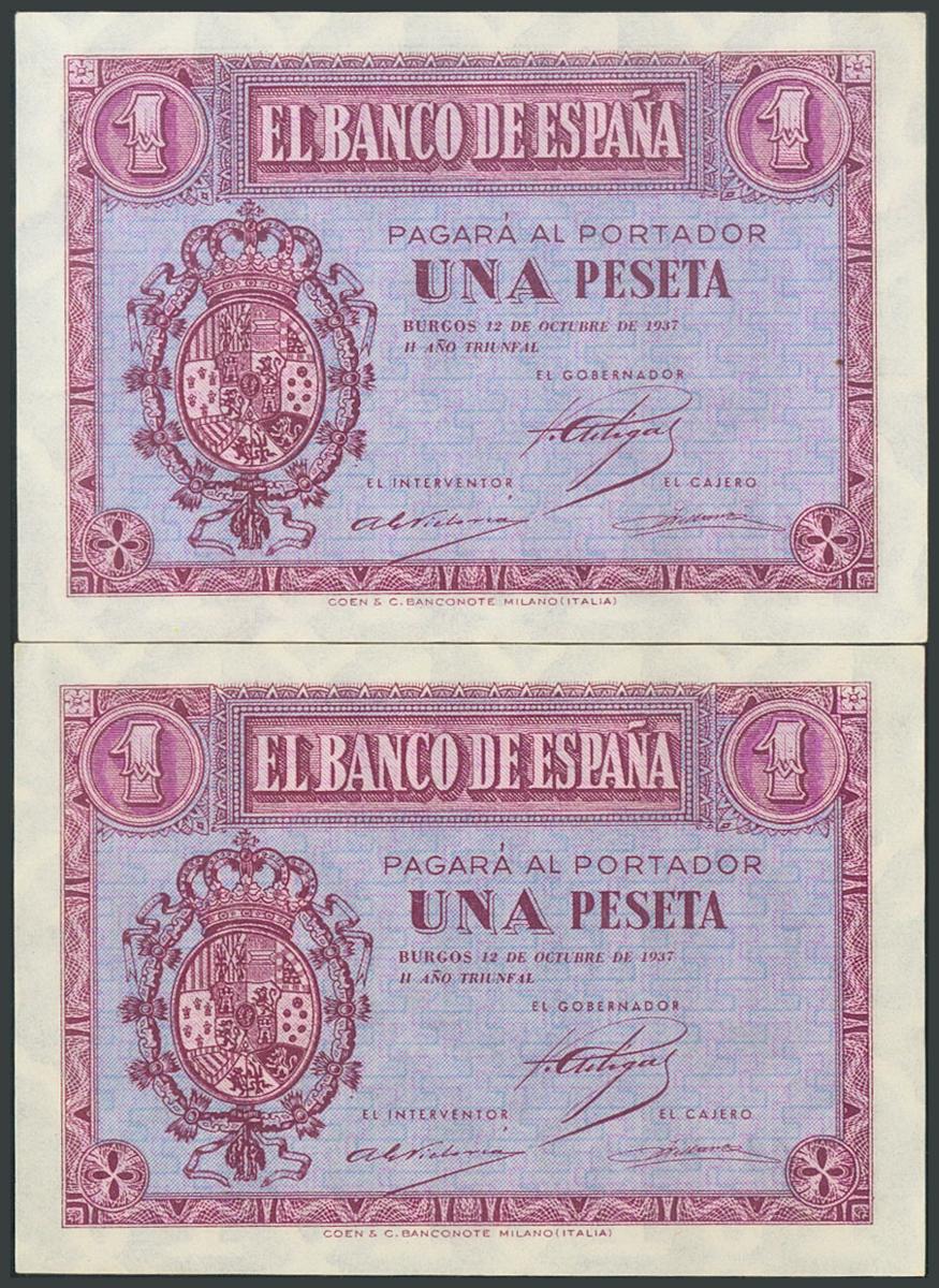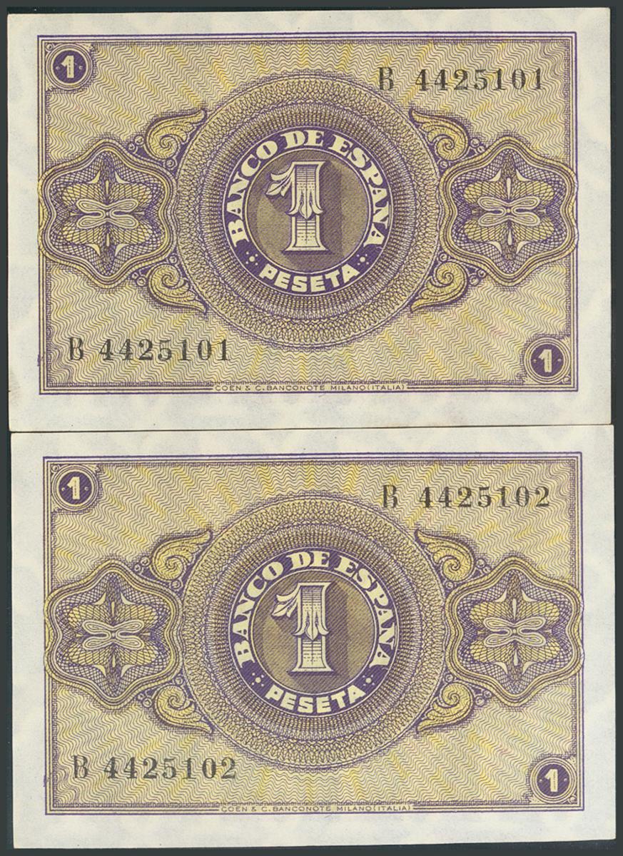 1 Peseta. 12 de Octubre de 1937. Pareja correlativa. Serie B. (Edifil 2017: 425a). Apresto original. SC.